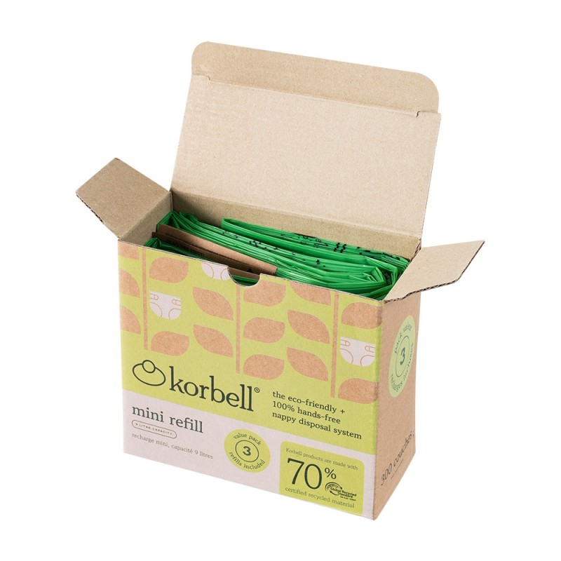 Korbell MINI blöjhink rymmer upp till 25 st blöjor för nyfödda innan den behöver tömmas. Hela refillen till Korbell MINI blöjhink räcker upp till 240 st blöjor för nyfödda.